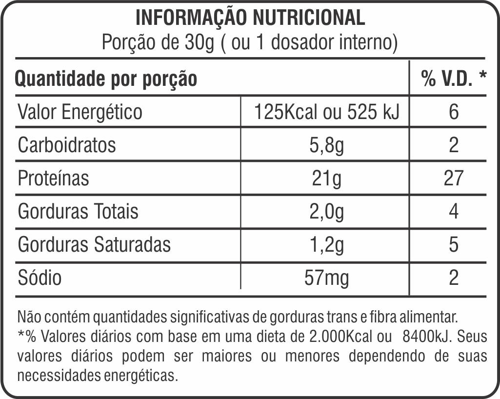 Formulado exclusivamente com a proteína concentrada do soro de leite (WPC), sendo uma proteína de excelente absorção considera de alto valor biológico. 100% Whey auxilia na construção muscular e fornecimento de energia, sendo ideal para complementar a dieta protéica em atletas e pessoas cujas necessidades de proteínas não estejam sendo satisfatoriamente supridas através da alimentação habitual.