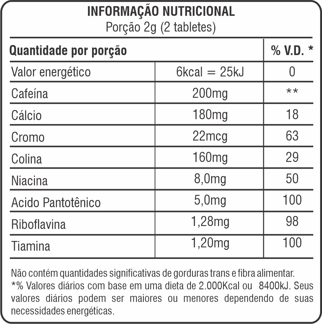 Cafeína, guaraná em pó, cálcio, colina, cromo, niacina, ácido pantotênico, riboflavina, tiamina, excipiente q.s.p estearato de magnésio