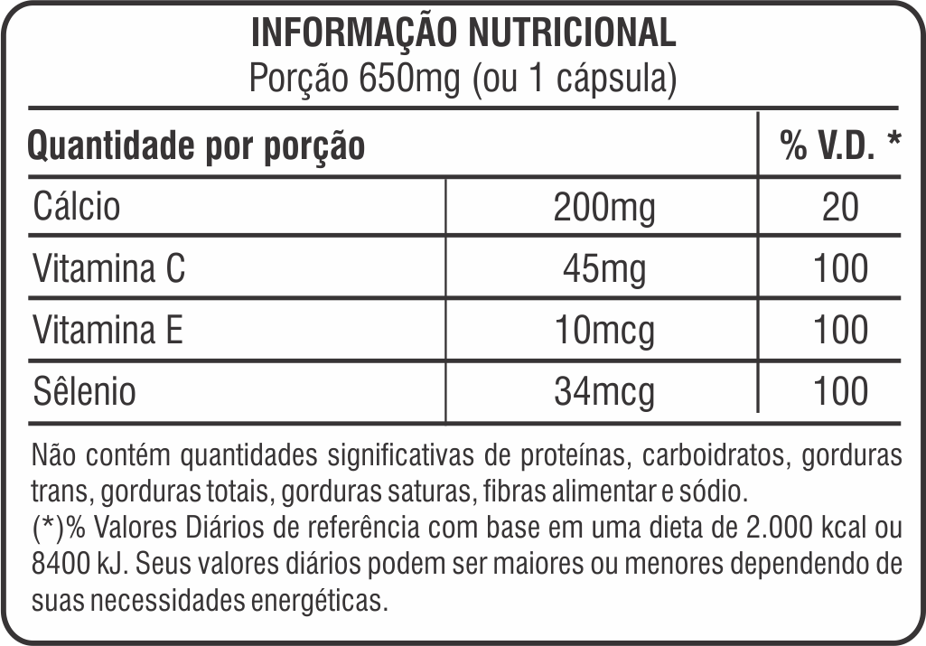 Carbonato de cálcio, ácido ascórbico, acetato de tocoferol, selenito de sódio, cápsula de gelatina (excipiente q.s.p. (metil parabeno, propil parabeno, gelatina e água p.w), corantes: dióxido de titânio (INS 171), amarelo tartrazina ( INS 102) e vermelho 40 (INS 129)).