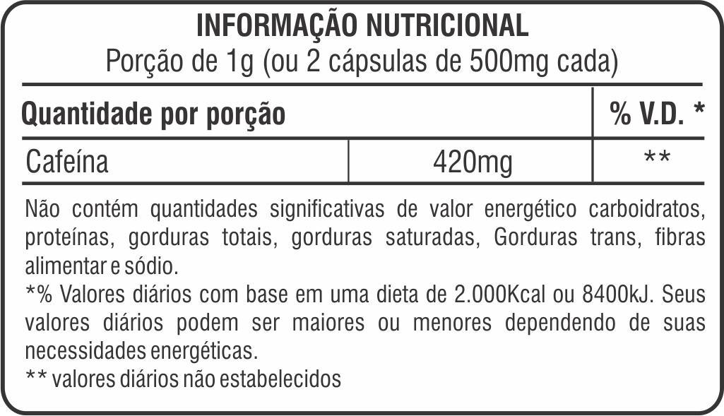 Suplemento composto de cafeína na forma de cápsula gel. Ideal para atletas que buscam melhorar seu desempenho físico, aumentando a resistência aeróbica.