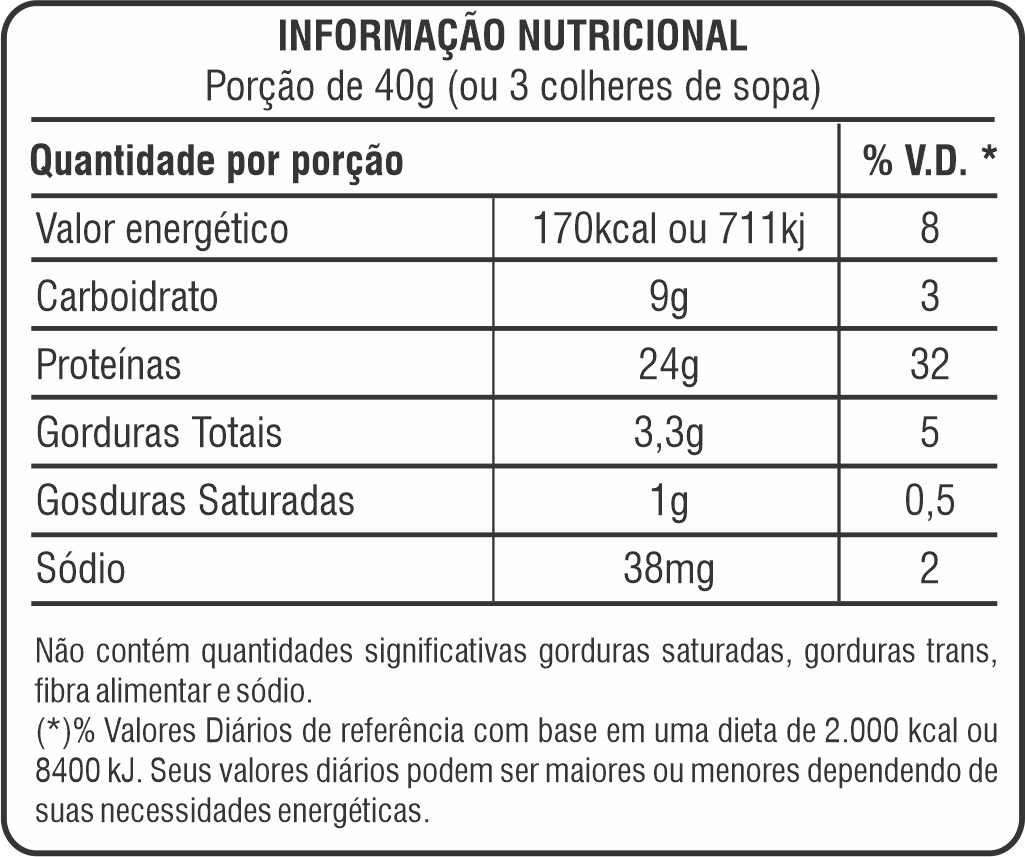 Adicionar três colheres das de sopa, aproximadamente 40g do produto em 300 ml de água ou leite, que deve ser consumido de 1 a 3 porções ao dia para complementar sua ingestão diária de proteínas