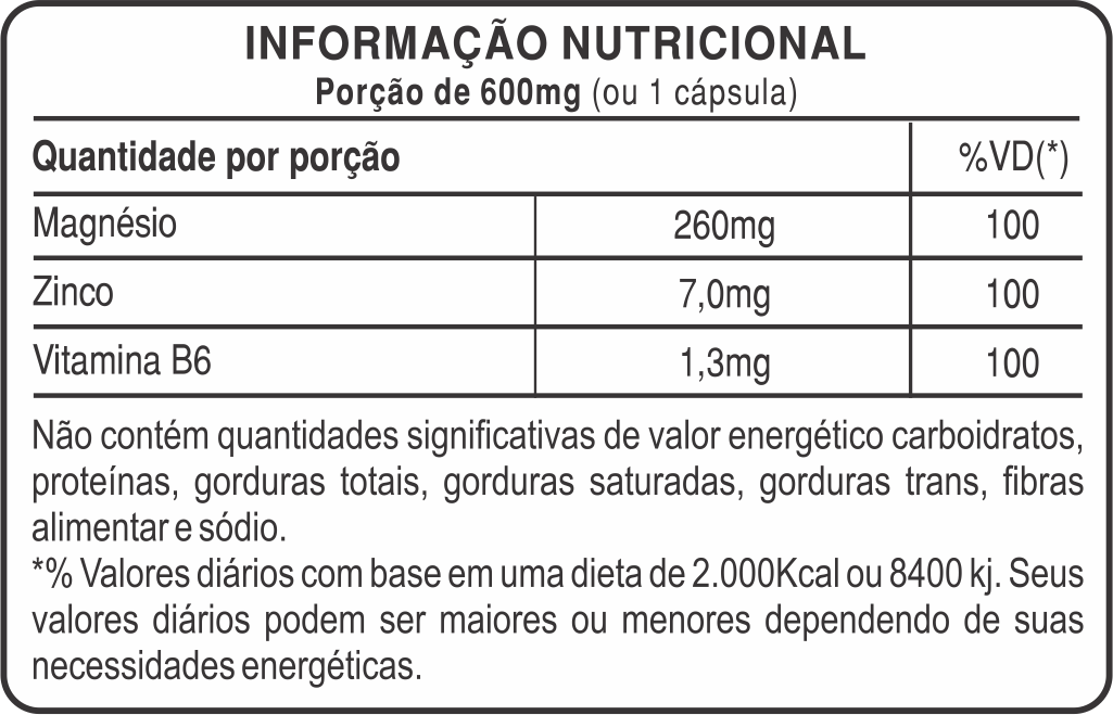 Oxido de magnésio, sulfato de zinco monohidratado, vitamina B6 e cápsula de gelatina (excipiente q.s.q (metil parabeno, propil parabeno, gelatina e água p.w), corantes: dióxido de tirânio (INS 171), vermelho amaranto (INS 123), Azul brilhante (INS 133) e vermelho eritrosina (INS 127)).