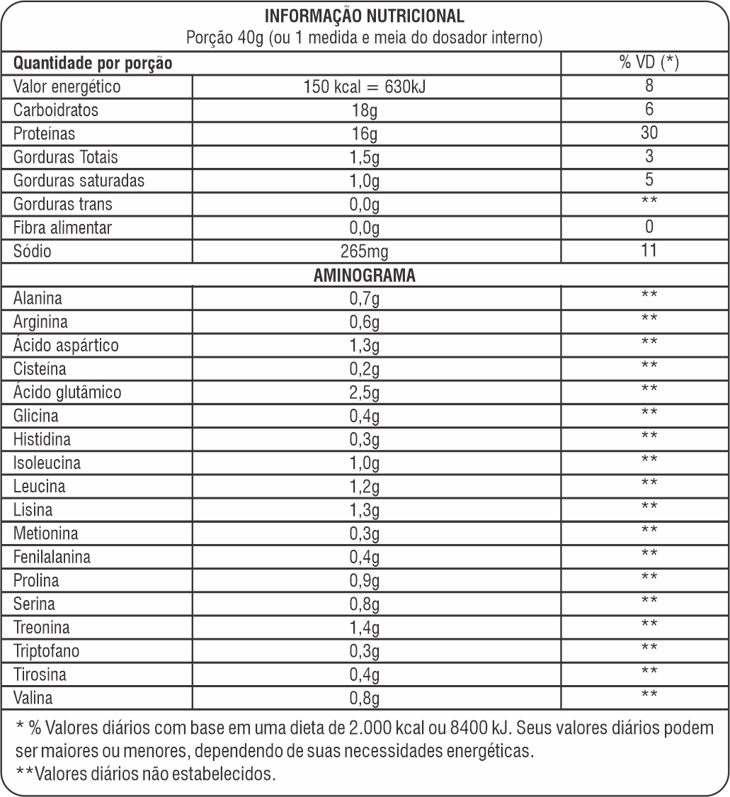 Suplemento destinado a enriquecer as necessidades protéicas diárias. Formulado exclusivamente com proteína concentrada do soro de leite, completo perfil de aminoácidos e rico em BCAA.