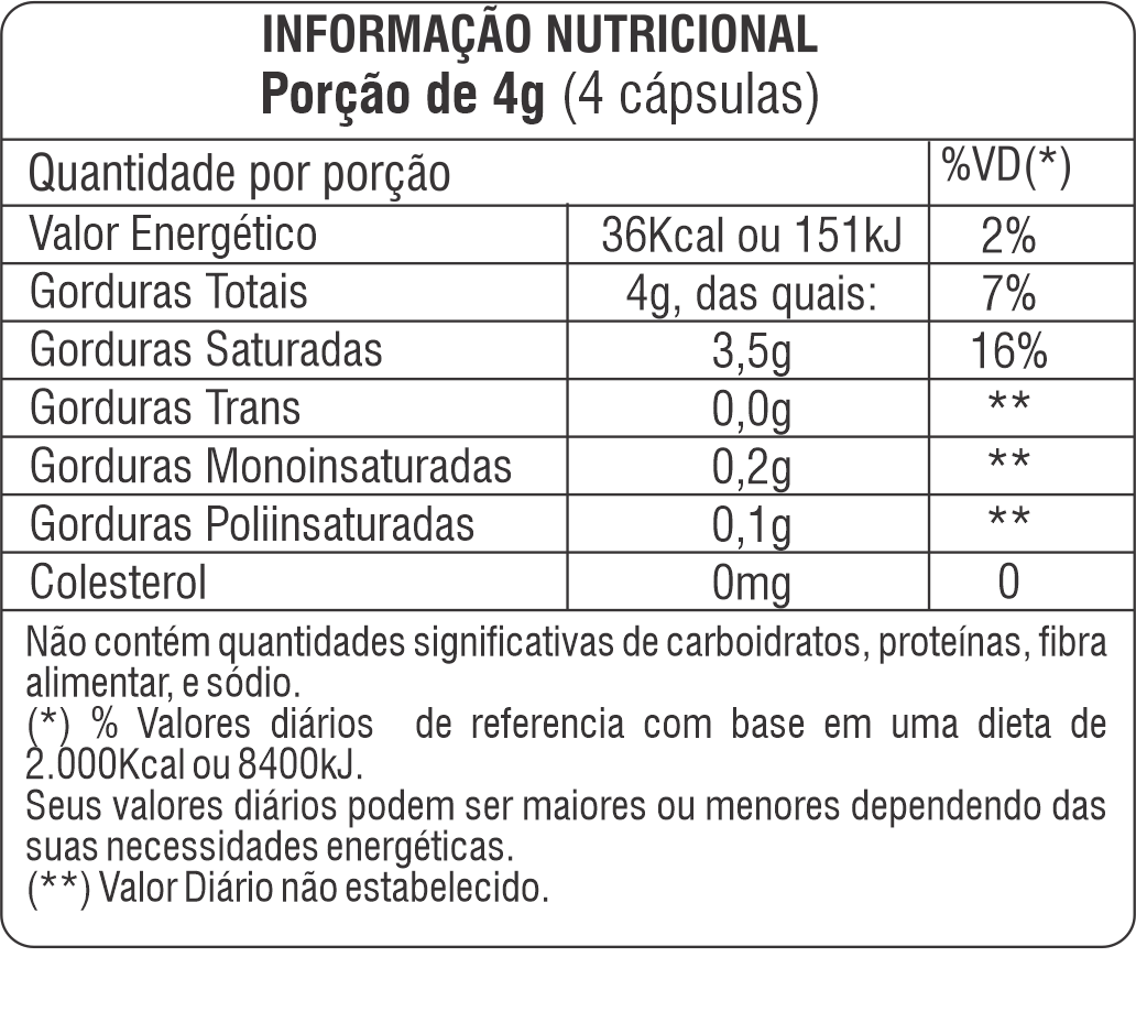 Óleo de Coco Virgem; Cápsulas: Geleificante: Gelatina INS 428, Veículo: Água Purificada e Umectante Glicerina INS 422.