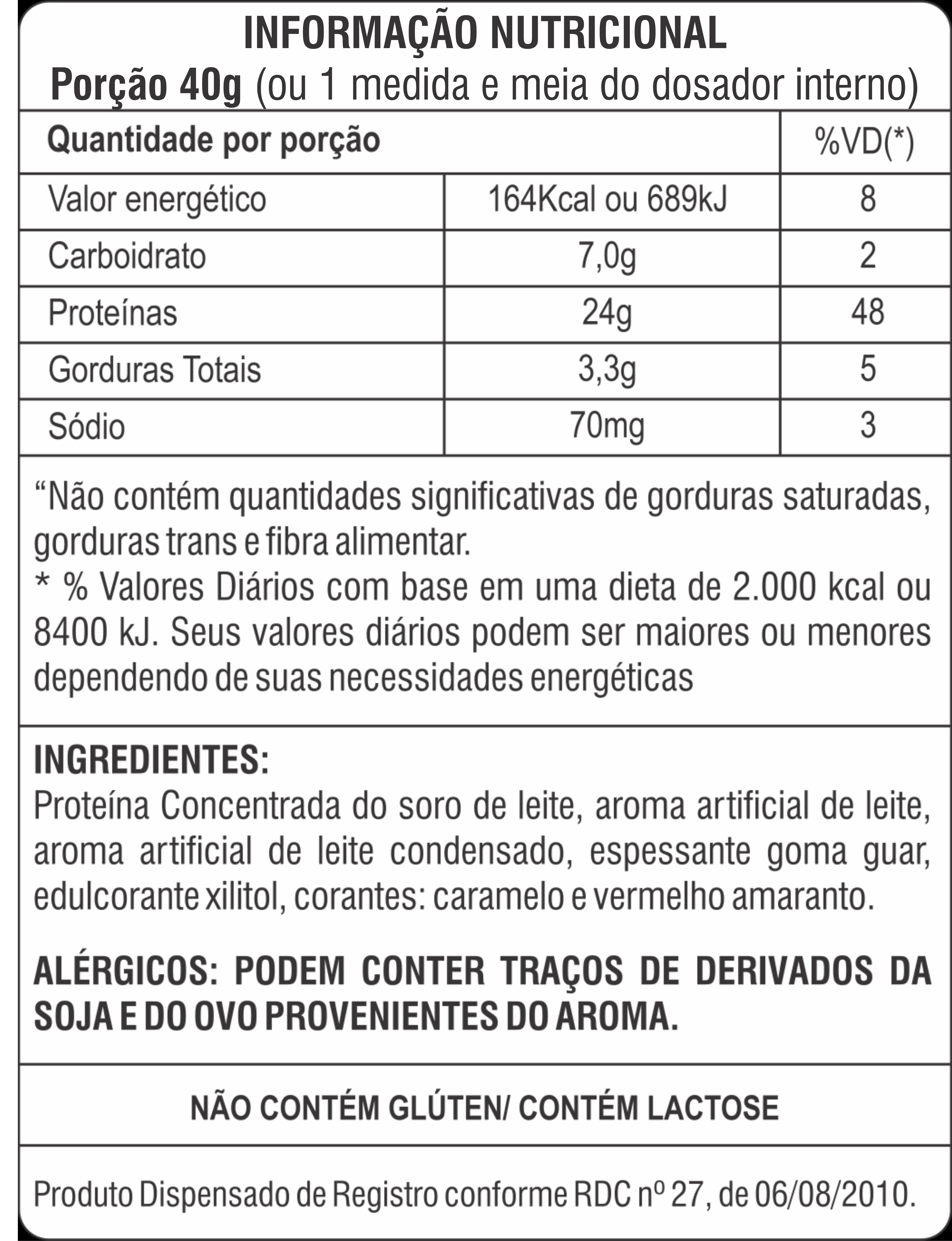 SABOR DOCE DE LEITE - Proteína concentrada de soro do leite, aroma artificial de leite, goma guar, edulcorante xilitol, corante artificial amarelo tartrasina e amarelo crepúsculo.
